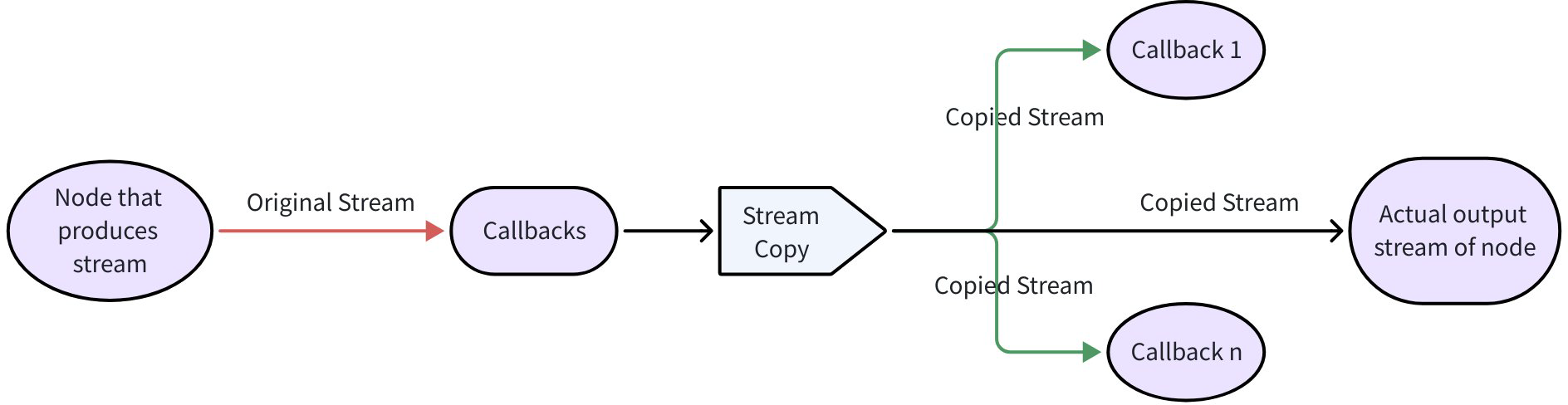 With true streaming components (e.g., ChatModel streams), callback consumers and downstream nodes both consume the stream. Streams are copied per consumer; ensure callback readers close their streams to avoid blocking resource release.