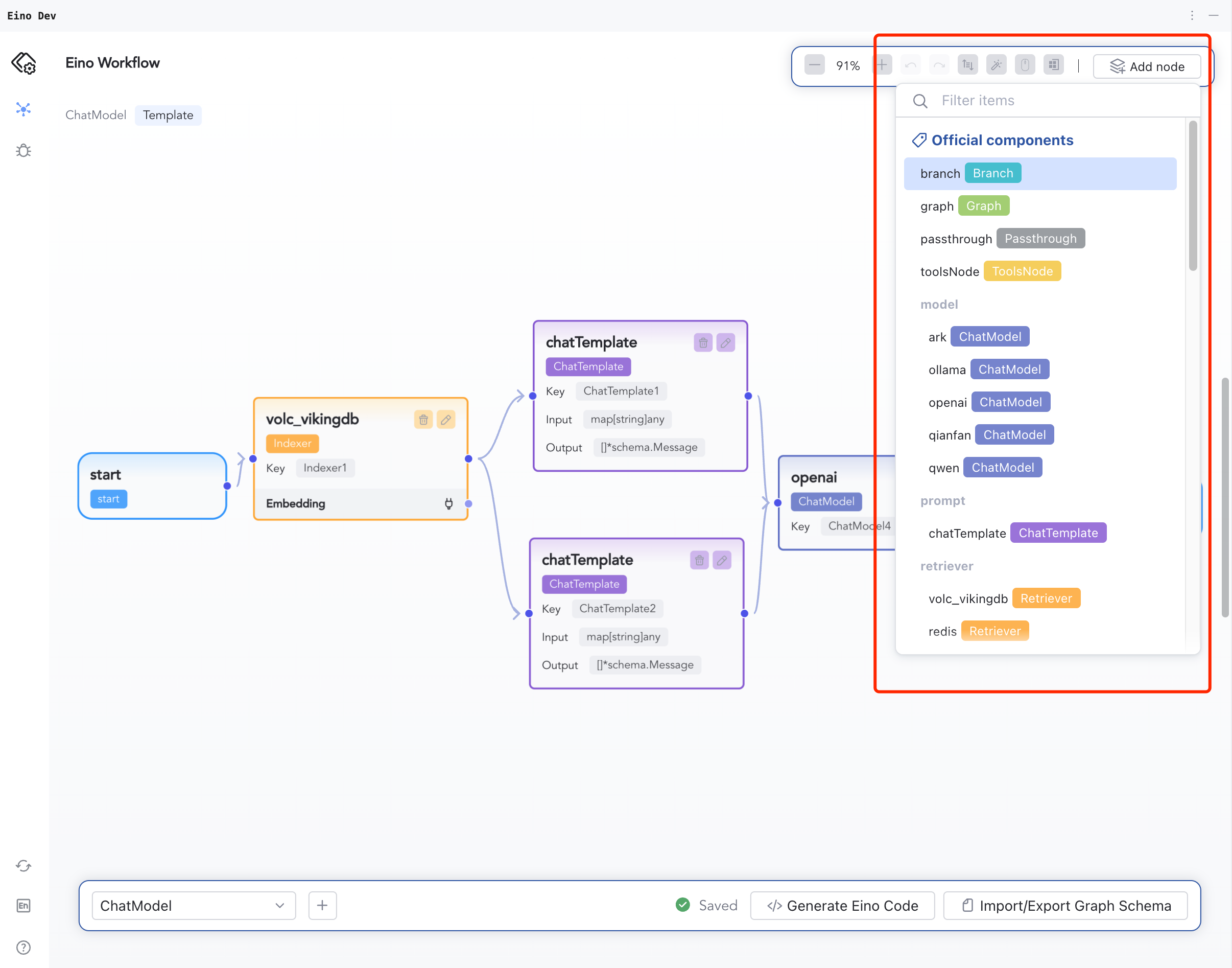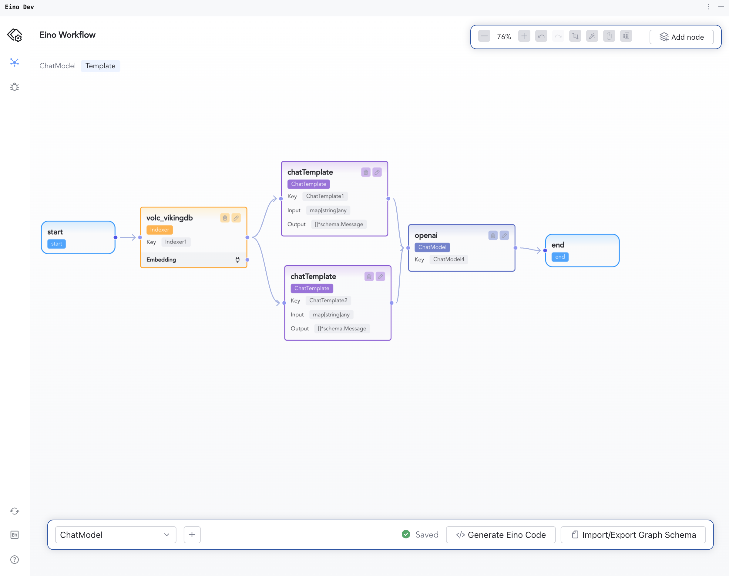 Eino is a Go framework for AI component integration and orchestration. The “Eino Dev” plugin helps you build AI applications more efficiently. 🚀