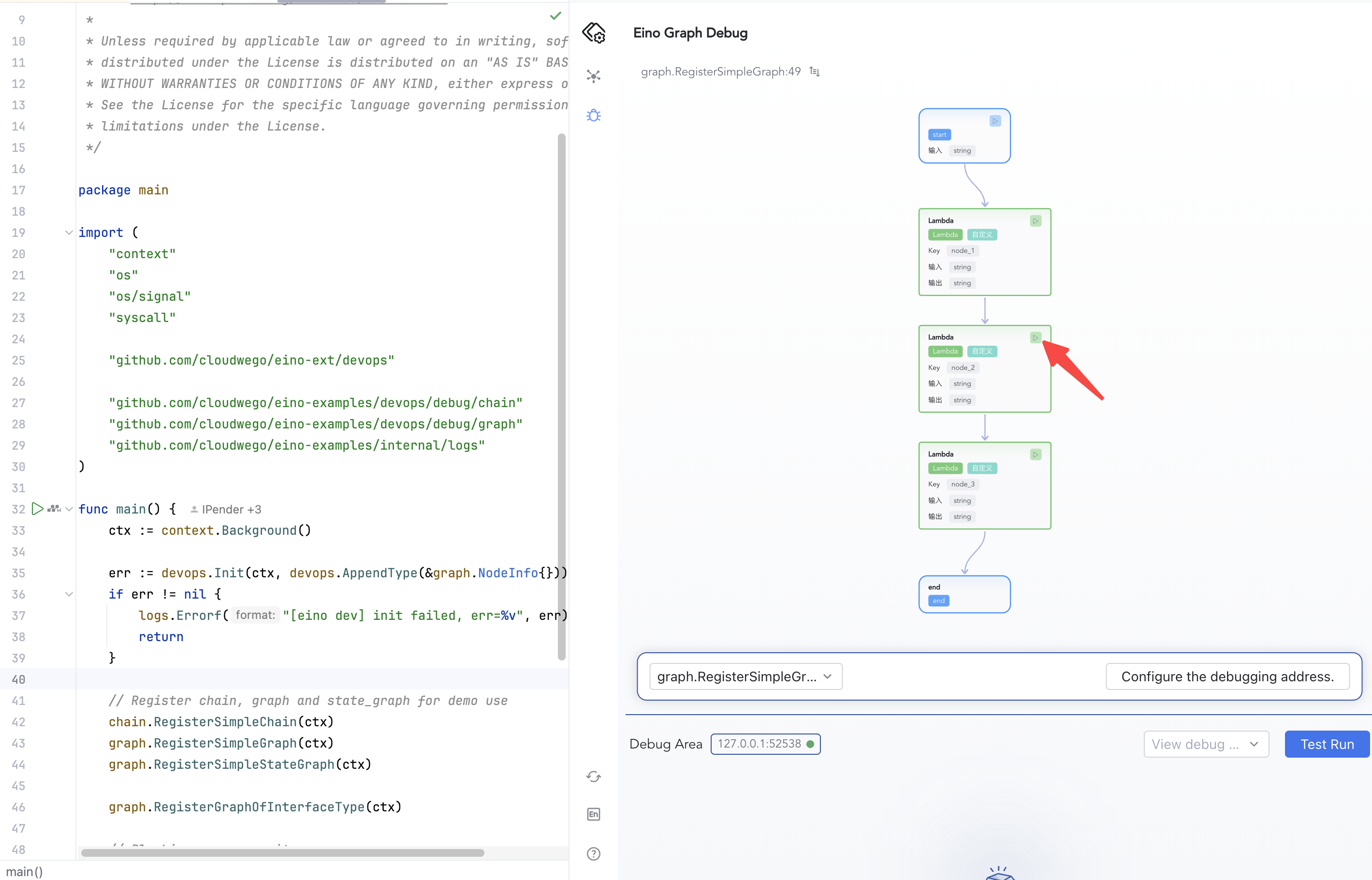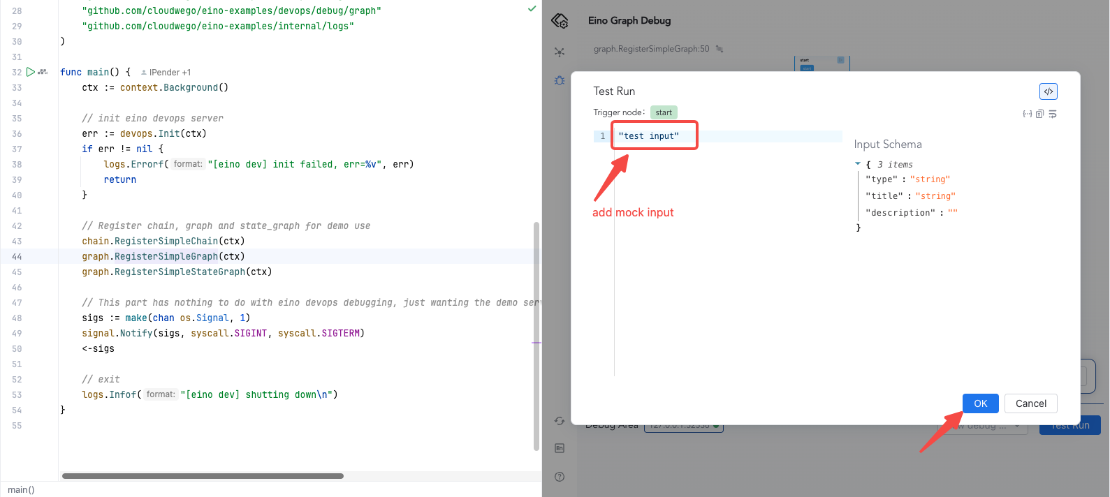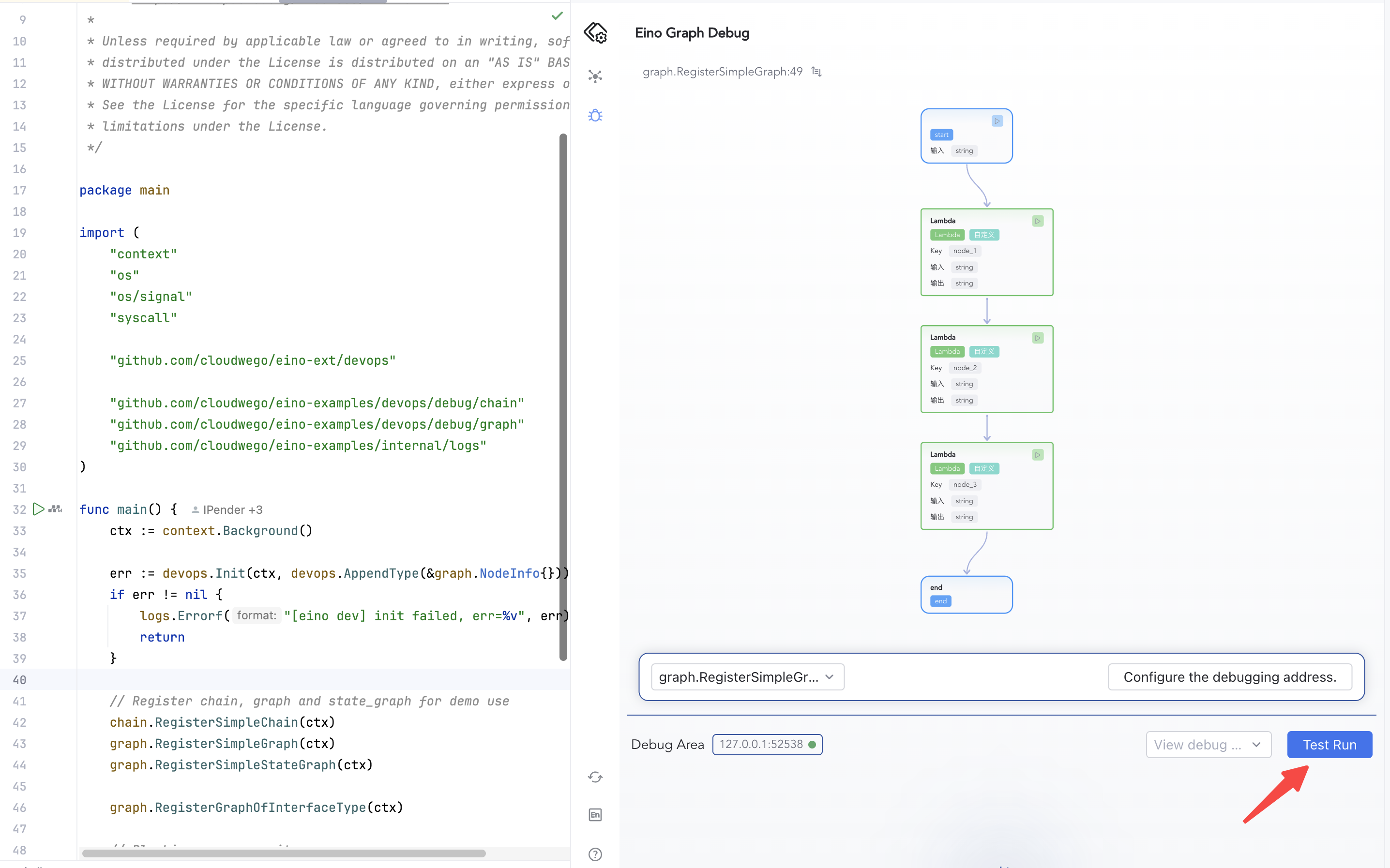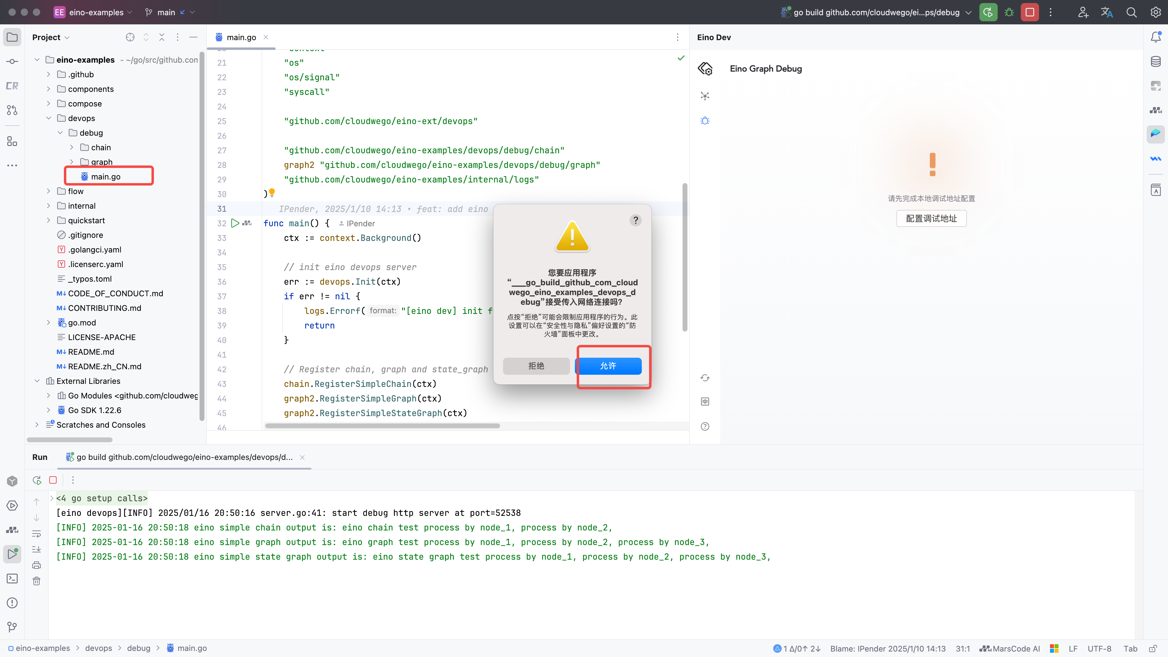 Open eino-examples/devops/debug/main.go and run main.go. The plugin launches a local HTTP service to connect to your process; allow network access if prompted.