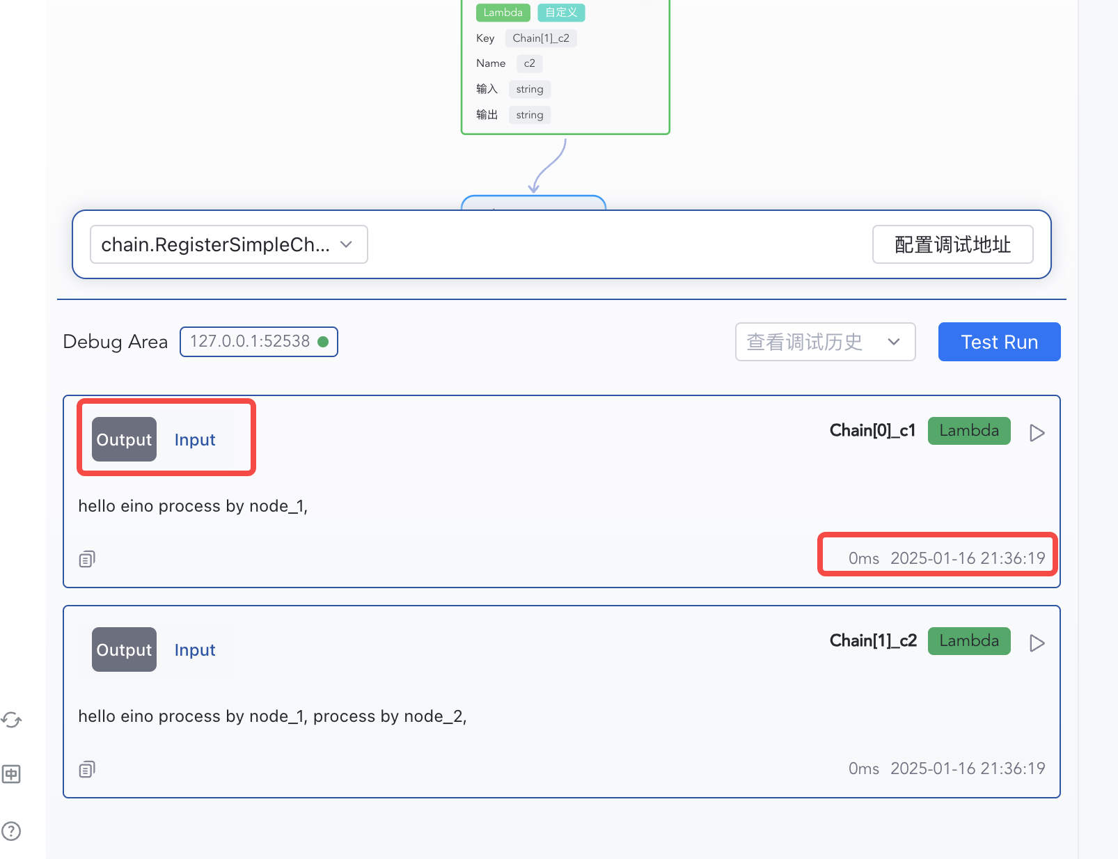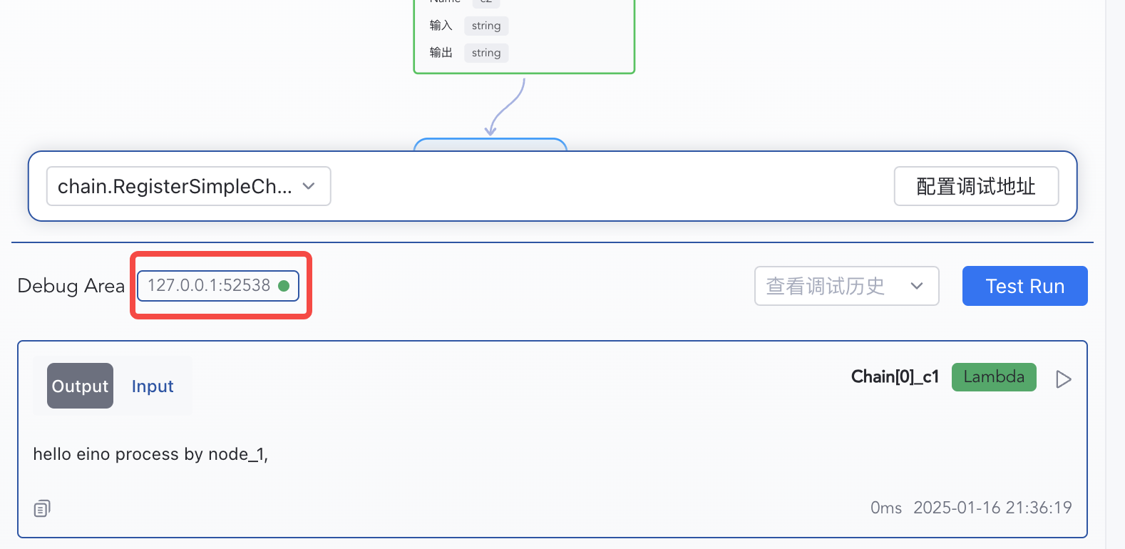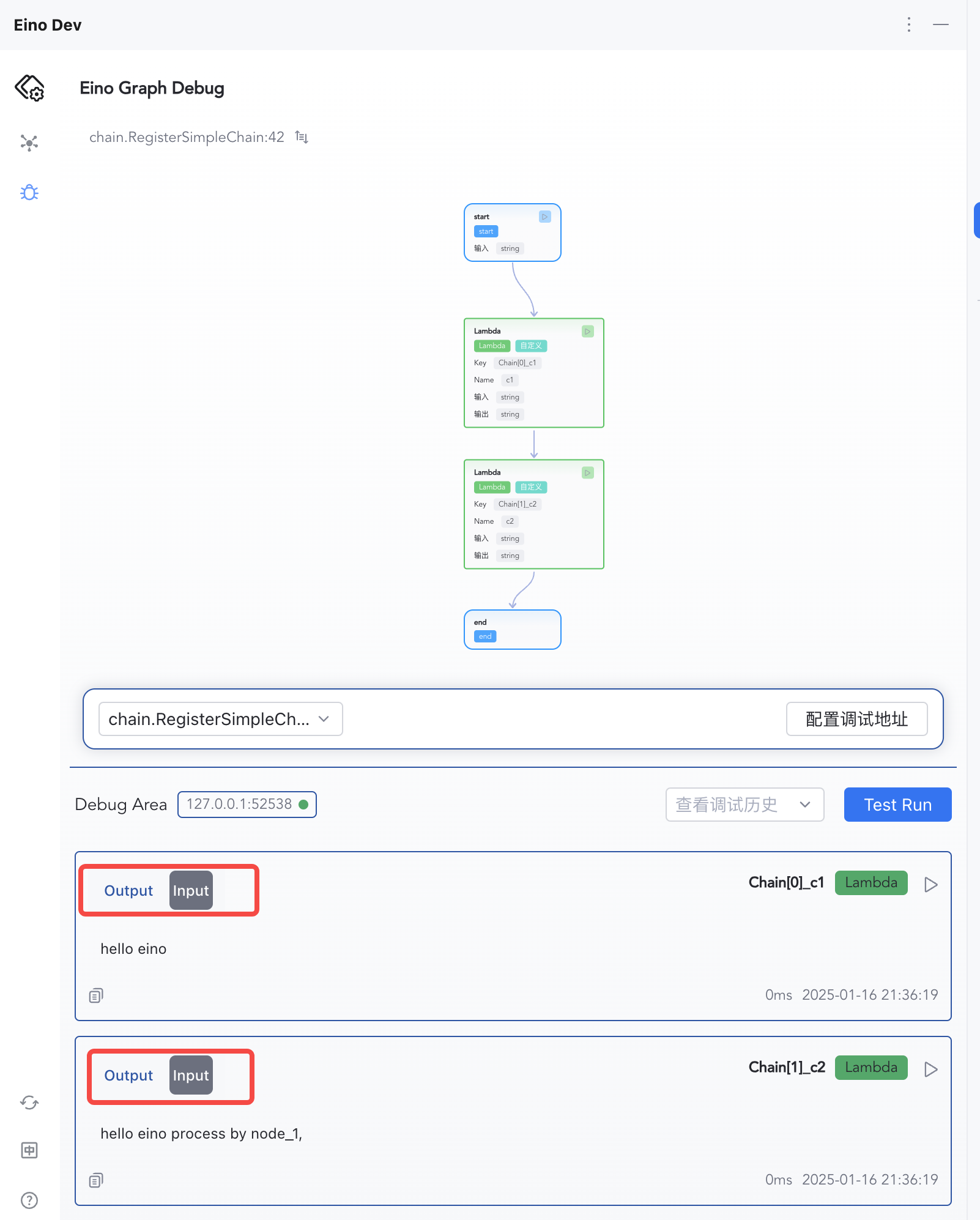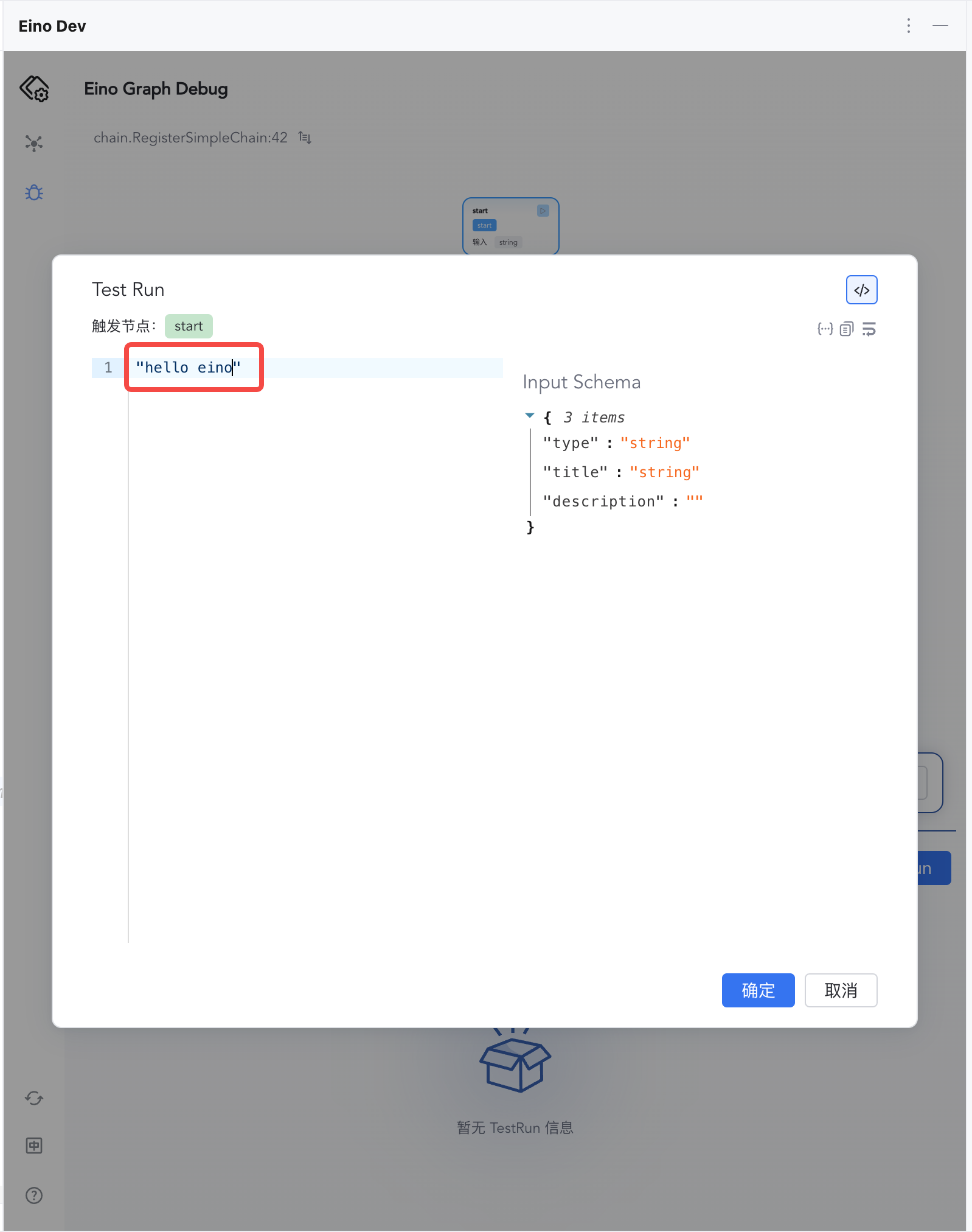 1) Click “Test Run” to start from START 2) Enter "hello eino" and confirm