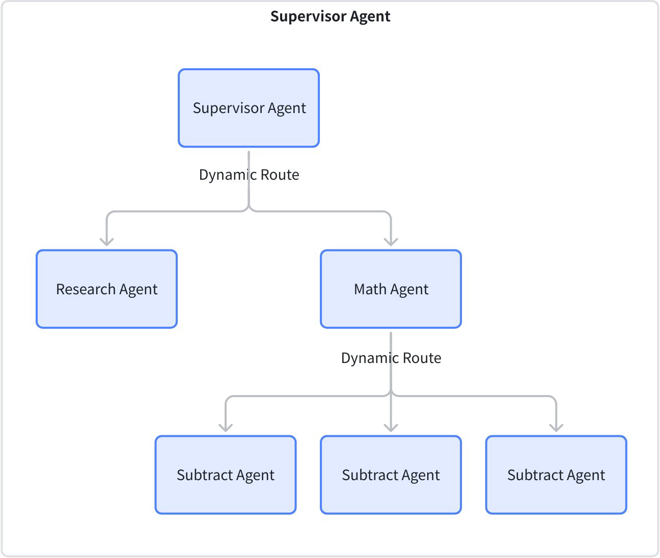 layered‑supervisorMulti‑tier supervision: top Supervisor manages Research Agent and Math Agent; Math Agent further manages Subtract/Multiply/Divide subagents.