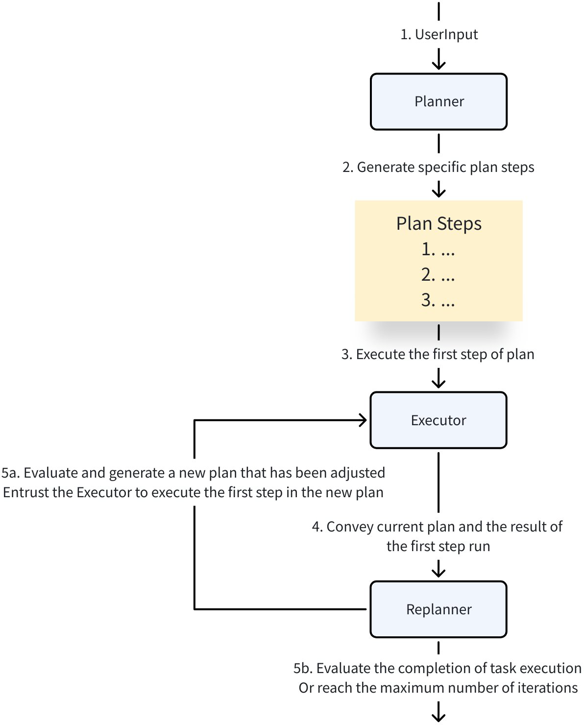 Planner creates plans; Executor executes steps via tools; Replanner evaluates progress and replans.